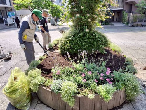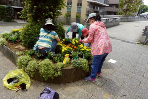 ぐるっと緑道とボランティアで構成する中川ルネッサンスプロジェクト会(NRP会)は、5月13日火曜日から20日火曜日の1週間かけて、中川駅前商業地区にある約60カ所の花壇やプランターに550株の夏花を植え替えました。