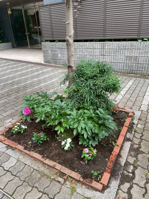 NRP会ガーデナーズの女性3人が、前日のまちなかマーケットで作業できなかった都市大側遊歩道の花壇などに夏花を植えました。