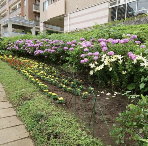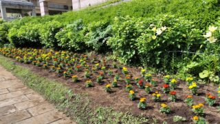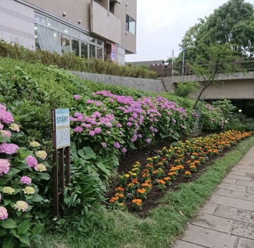 中川駅方向からくさぶえのみちに入ると両側にきれいな花が咲く花壇があります。この花壇を管理しているのが「くさぶえのみち入口中川広場公園愛護会」です。