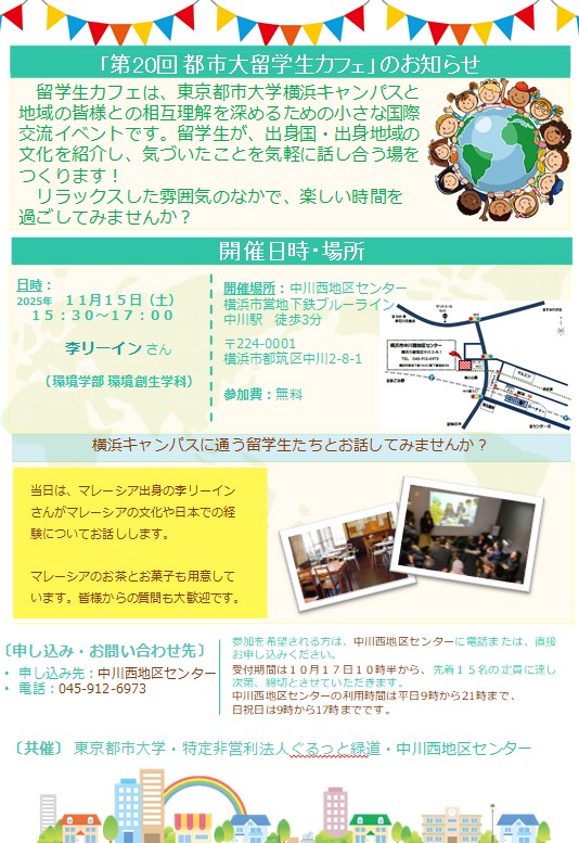 「留学生カフェ」は、東京都市大学、ぐるっと緑道、中川西地区センターの共同で開催されています。毎回、東京都市大学に留学している学生に母国の文化等を聞き、地域との交流を図る目的で開催されています。