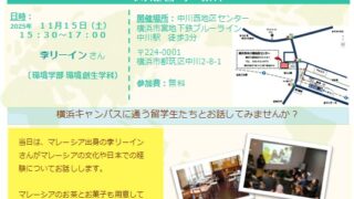 今回は、マレーシア出身の李(リー)さんがマレーシアの文化や日本での経験についてお話しします。マレーシアのお茶とお菓子も用意しています。皆様からの質問も大歓迎ですので、是非お申し込みください。