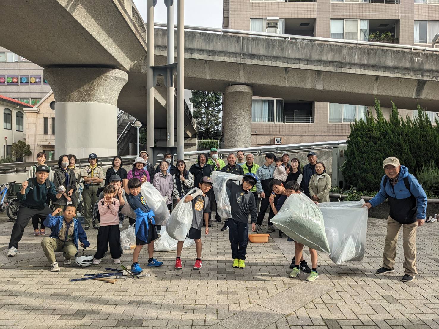 この日の参加者は、事務局の中川周辺の街づくりを考える会、ガーデンヒルズ自治会、サントゥール中川分譲住宅自治会、中川駅前商業地区振興会、中川西小学校の親子、事業者(ファミリーマート、Asobi Gym)、ケアプラのボランティア、新たにボーイスカウトの皆さんなど総勢30人、まちをきれいにしてくださりありがとうございます!