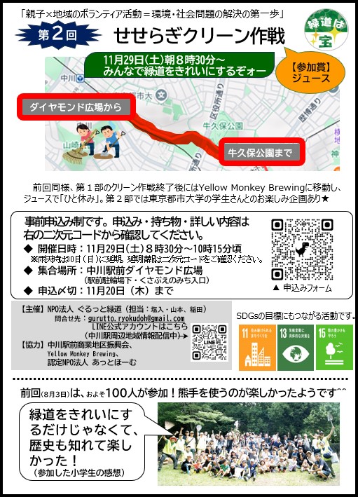 緑道は草木の緑、せせらぎ、そこに住むさまざまな生物の環境と長い道は散歩、ランニング、様々な遊びができる都筑区民にとって宝です。しかし、その緑道を土木事務所と高齢化とメンバーが減少する愛護会だけでは維持ができなくなっています。特にせせらぎは落ち葉、木の枝、泥で汚れています。11月はGREEN×EXPO2027の500日前ですので、みんなで緑道をきれいにしましょう!