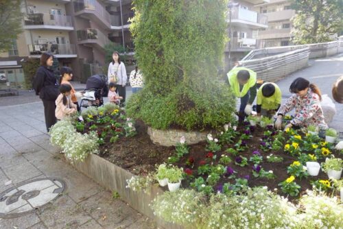 NRPメンバーと中川西小学校の親子、ケアプラザのボランティア、東京都市大学の学生等が参加し、歩道橋上のプランター、遊歩道の花壇とプランターにノースポール、パンジー、ビオラの花苗とチューリップ等の球根を植えました。また、全員でステージ広場の落ち葉集めをしました。