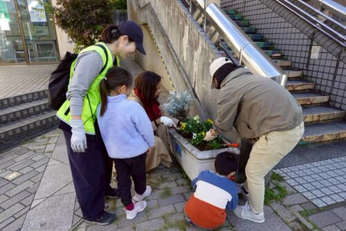 NRPメンバーと中川西小学校の親子、ケアプラザのボランティアが参加し、ステージ広場、花と香りのみち、駅前広場、学生通り、くさぶえのみち入り口公園等の花壇、プランターにストック、パンジー、ノースポール等の花苗とチューリップの球根を植えました。