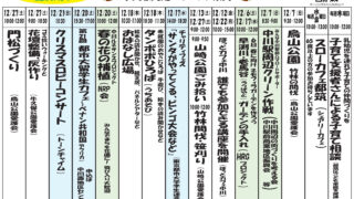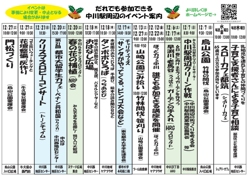 中川周辺の12月イベントスケジュール ぐるっと緑道 2025.11.30 12月に行われる中川周辺の様々な団体によるイベント、活動スケジュールをお届けします。 クリスマス、年末の楽しいイベントと春に向けてのボランティア活動がたくさん予定されています。クリスマスシーズンを楽しみましょう。