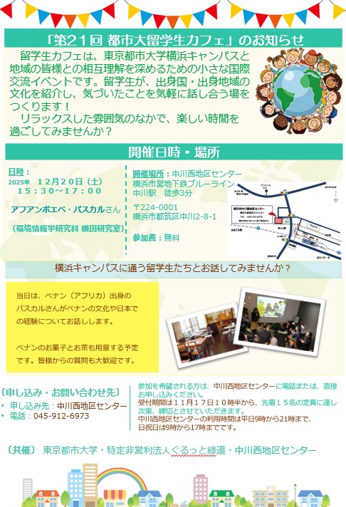 「留学生カフェ」は、東京都市大学、ぐるっと緑道、中川西地区センターの共同で開催されています。毎回、東京都市大学に留学している学生に母国の文化等を聞き、地域との交流を図る目的で開催されています。