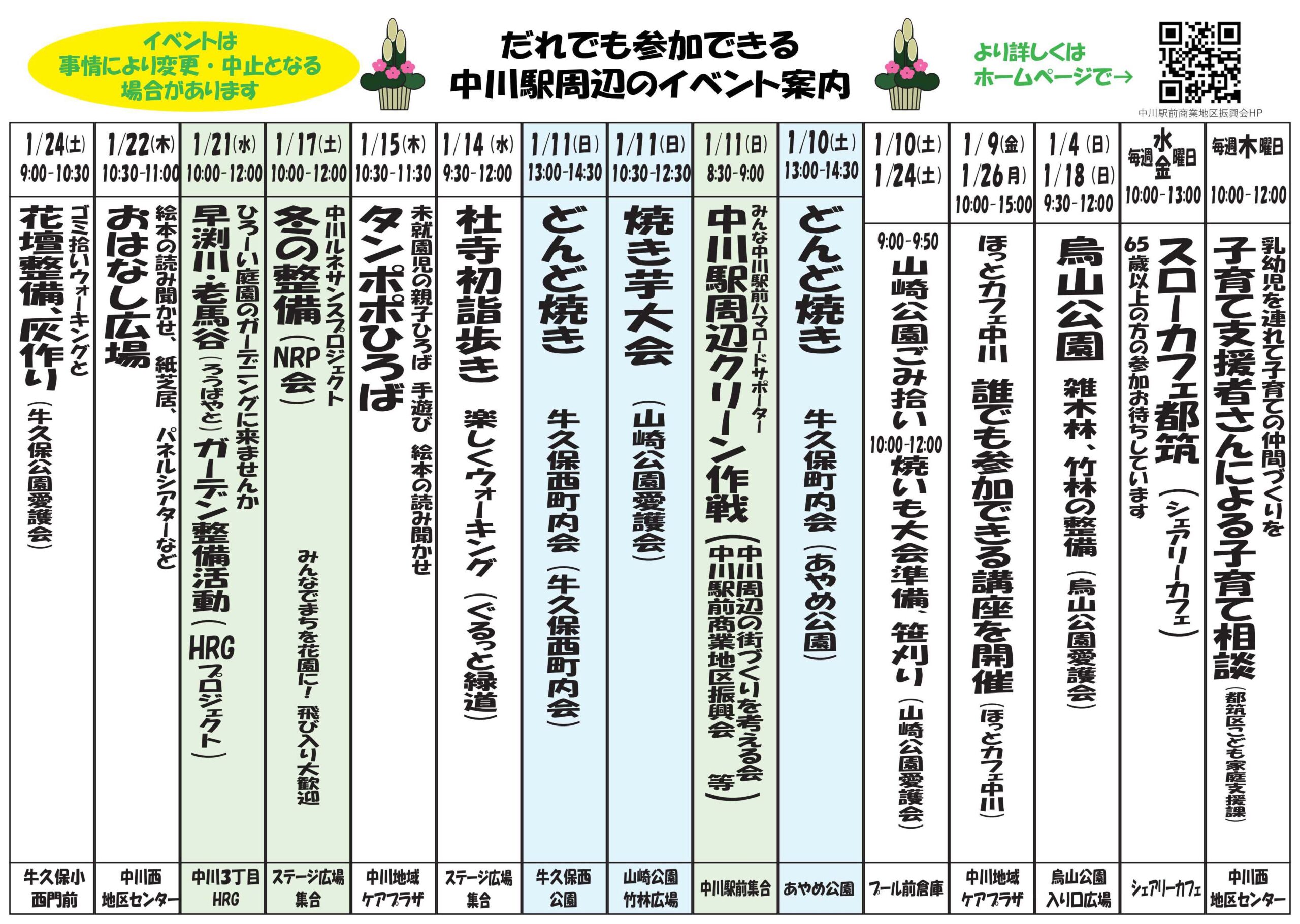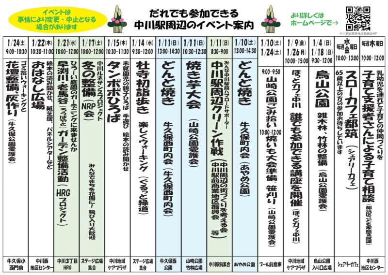 中川周辺の1月イベントスケジュール ぐるっと緑道 2025.12.31 あけましておめでとうございます 1月に行われる中川周辺の様々な団体によるイベント、活動スケジュールをお届けします。新年ならではのイベントが盛りだくさんです。楽しい伝統行事やボランティア活動がたくさん予定されていますので、ご参加ください