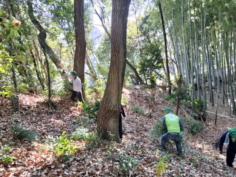 烏山公園愛護会の整備活動が1月4日(日)9時半~12時行われました。14名のメンバーが雑木林の間伐とアズマザサの刈取りを行い、里山がスッキリ、綺麗になりました。作業終了後は、木々の間から青空の中に富士山が見える烏山の頂上で、新年会を行い交流を深めました。