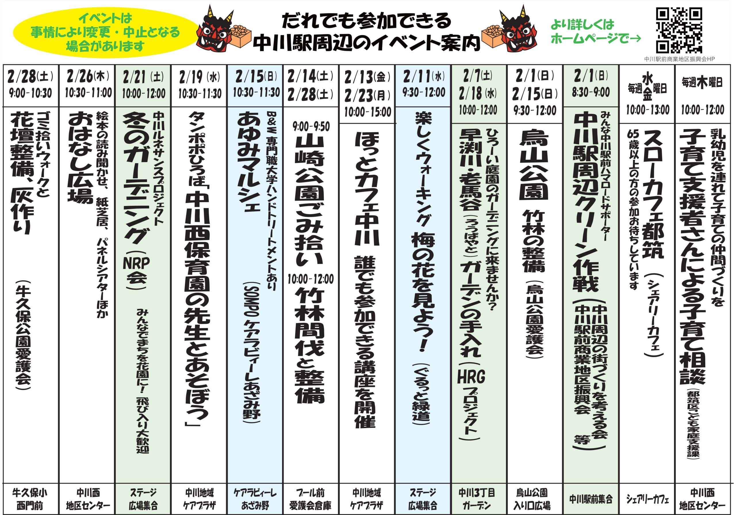中川周辺の2月イベントスケジュール ぐるっと緑道 2026.01.31 2月に行われる中川周辺の様々な団体によるイベント、活動スケジュールをお届けします。寒い日が続いていますが、2月4日は立春、もうすぐ春です。楽しい伝統行事やボランティア活動がたくさん予定されていますので、寒さに負けずご参加ください。