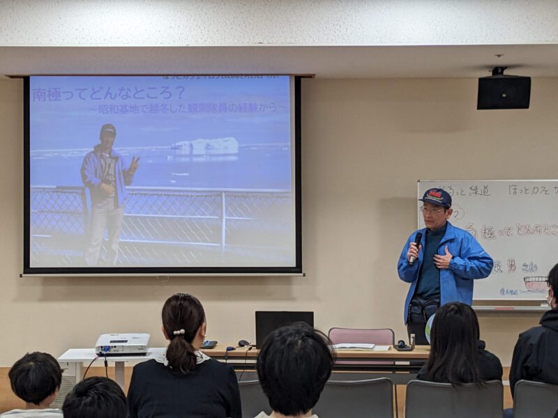 中川にお住まいで、気象庁にお勤めの中村辰男さんより、南極の昭和基地にて2回越冬したご経験のお話を話していただきました。たくさんの写真や資料を見せていただきながら、当時の南極での気象観測や現地での生活の様子について教えていただきました。