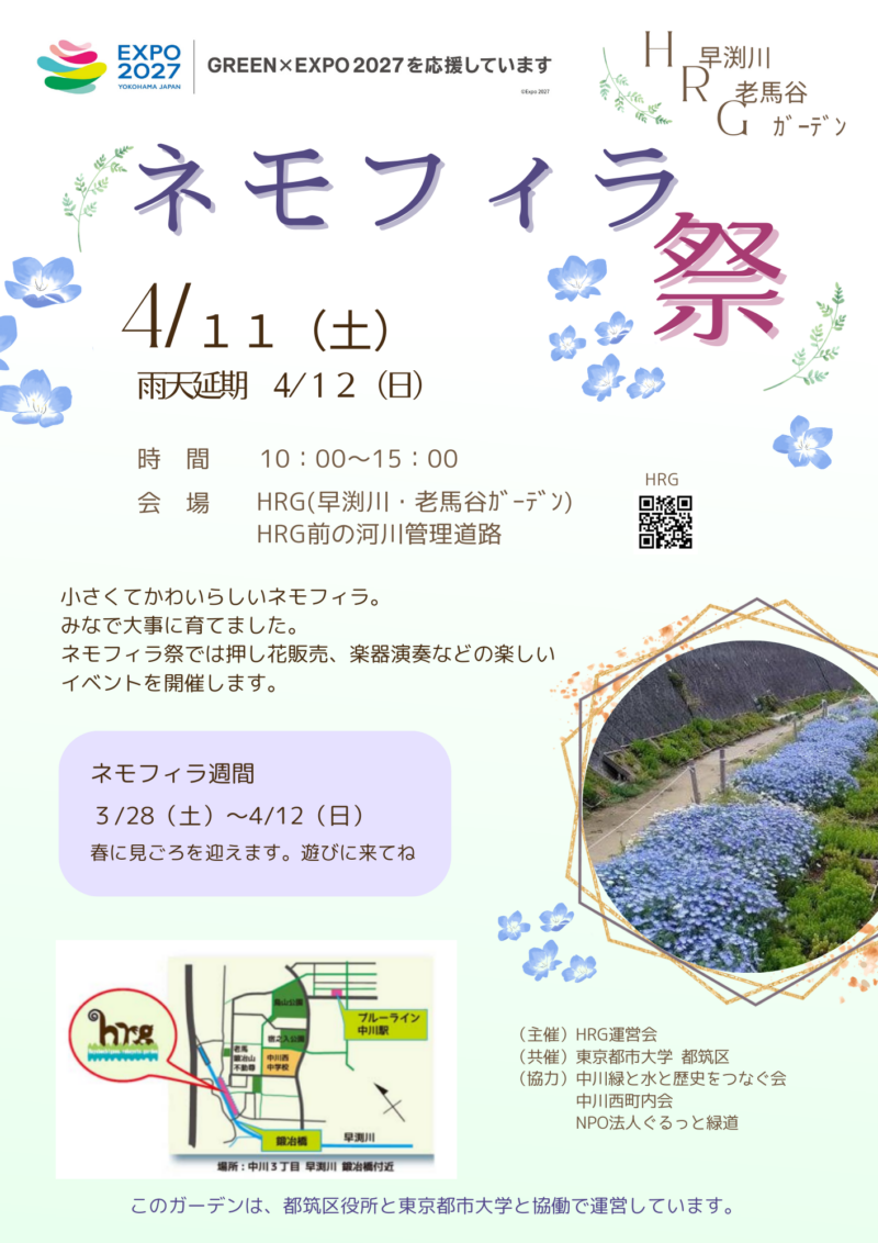 4/11(土)10時~早渕川・老馬谷ガーデン(HRG)でネモフィラ祭(主催:HRG運営委員会・共催:都筑区役所・東京都市大学)が開催されます。