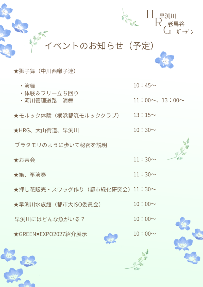 4月11日のネモフィラ祭には、獅子舞、早渕川の魚を紹介する水族館、スワッグ作り、モルック体験などの楽しいイベントも多数予定されていますので、是非お越しください!